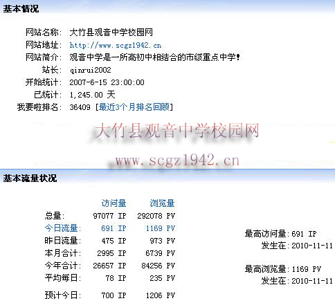 隨著網(wǎng)站的不斷發(fā)展,點擊量也是越來越多了。以前的免費空間已經(jīng)不再適應(yīng)發(fā)展了,往往一個月才幾天就因為流量過大,網(wǎng)站被迫關(guān)閉。不得不想辦法了,那時,學(xué)校對自動免費宣傳它的網(wǎng)站并不關(guān)心,我也不好意思去向?qū)W校要錢,一度想關(guān)閉它算了?伤俏业摹昂⒆印毖剑也蝗绦。只好三思后,自己掏腰包,去買了付費空間。這樣,網(wǎng)站再一次運作了下來。時間一天天地流逝,我每天打開電腦的第一件事情就是去我的網(wǎng)站看一看它是否還在正常運轉(zhuǎn)。功夫不負(fù)有心人,網(wǎng)站一天天地壯大起來了。校園網(wǎng)已被很多網(wǎng)站收錄,也被很多的搜索引擎收錄。比如:百度,Googleyahoo、sogou、soso等。網(wǎng)友來自全國各地,甚至香港、臺灣等地區(qū)以及美國、加拿大、澳大利亞、越南、愛爾蘭等歐洲、亞太地區(qū)都有訪問者。而且每天網(wǎng)站的流量能平均達(dá)100IP左右,同時在線人數(shù)能達(dá)60多人。