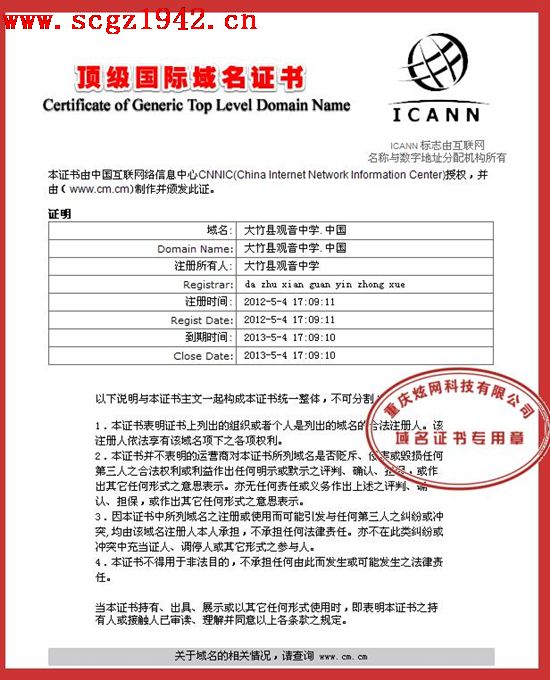 成功申請到中文域名:大竹縣觀音中學(xué).中國