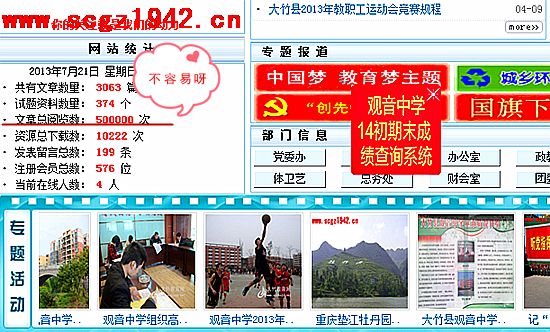 記得,做的第一個網(wǎng)頁就是網(wǎng)站主頁,主頁到底要做成哪個樣子的才好看呢?我上網(wǎng)到處去查看其它學(xué)校網(wǎng)站,最后,看到某中學(xué)(不好明說,怕他們說我有侵權(quán)之嫌。)的主頁還可以,于是,就仿照其慢慢來修改?梢韵胂螅粋從來沒有做個網(wǎng)站的外行來做網(wǎng)頁,難度之大,對網(wǎng)頁中的很多語言都不明白,對程序更是不懂,唯一憑著有點外語水平和一點計算機(jī)應(yīng)用能力,在那里慢慢摸索,不知道修改了多少個頁面,不知道熬了多少個休息日。(說到這里,要強調(diào)一下,平時要上班,做這些事,都是利用中午、下午、周末等空閑時來做的,不然,有人會說我是那種不務(wù)正業(yè)的人。)真的是沒想到建站并非自己想象的如此簡單,不但要學(xué)習(xí)網(wǎng)頁設(shè)計,還要學(xué)習(xí)建站程序、備案、解析域名等知識,以及作圖方面的PS、FW也要學(xué)習(xí)。每天就這樣硬著頭皮邊學(xué)邊做,效率可想而知,網(wǎng)頁是做好了又改,改好又刪,刪了又做,一個站標(biāo)就搞了幾天才勉強滿意…….半個月過去了,不但網(wǎng)站沒上線,連基本的框架都沒弄好,每天下班后的時間眨眼就過了。雖然這樣邊學(xué)邊做真的很累,一個小小的細(xì)節(jié)往往都會花費很多的時間,但是每當(dāng)一個難題有了解答,每當(dāng)學(xué)會了一個新的知識,都會讓我高興好半天,而最讓人享受的莫非那小小的成就感。就這樣,歷經(jīng)近3個月的時間,才漸漸地對網(wǎng)頁制作有了一些了解。于是,就這樣一個一個網(wǎng)頁地制作,記得當(dāng)時,網(wǎng)站正式上線前后,就已經(jīng)做了近100多個靜態(tài)網(wǎng)頁的內(nèi)容。并且把網(wǎng)站命名為“大竹縣觀音中學(xué)校園網(wǎng)”,免費二級域名:scgz1942.8891.com。觀音中學(xué)校園網(wǎng)的前身就正式出現(xiàn)在網(wǎng)絡(luò)上了。不知道那時自己花了多少功夫,花了多少心血?現(xiàn)在想起來,我真的很感激的是我的家人,他們默默地支持我,沒有說我的不是,也幾乎沒有讓我做什么家務(wù)活,只要有空我就就搞這么個網(wǎng)站。所以,現(xiàn)在有人問我做這個網(wǎng)站有什么感受,我只想說,這個網(wǎng)站就象是我的親生孩子,是我一手制造出來的。
