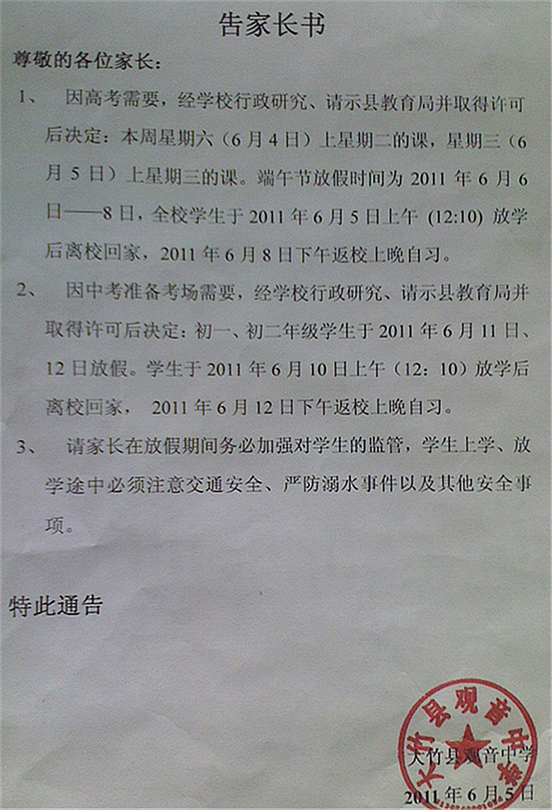 2011年觀音中學(xué)放“端午”節(jié)告家長書