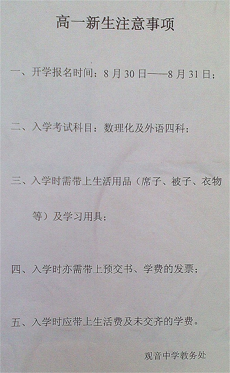 您現(xiàn)在的位置:觀中網(wǎng)->觀中新聞->校園時訊->觀音中學(xué)2014高新生注意事項