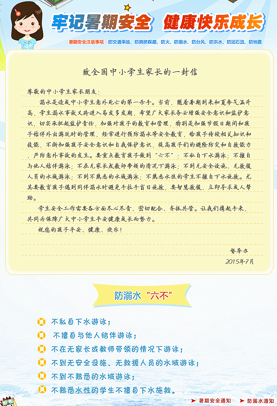 希望同學(xué)們增強(qiáng)安全意識(shí),牢記學(xué)校所教的安全知識(shí),按照家長的叮囑,注意游泳安全,不到不明水域游泳。在假期外出活動(dòng)期間,切實(shí)注意交通安全。參加力所能及的學(xué)工學(xué)農(nóng)勞動(dòng)、家務(wù)勞動(dòng)、社會(huì)實(shí)踐或志愿服務(wù),過一個(gè)平安、健康、充實(shí)、有意義的假期。