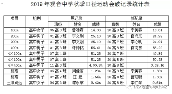 評委團隊9時許,所有班級完成隊列隊形表演后,學校黨總支書記、校長趙云建同志致辭:寄語所有運動健兒賽出風范,賽出水平;鼓勵全校師生每天堅持運動,擁有健康的體魄,方能更好地投入到工作、學習中去;最后預祝此次運動會取得圓滿成功。隨后,體育老師鄧舟舟代表裁判組、高三學生潘習巧代表運動員相繼宣誓,組委會負責人李廣俊老師強調比賽注意事項。伴隨著趙校長宣布運動會比賽正式開始,為期3天的2019年秋季運動會正式拉開帷幕。在學校安辦、政教、團委、總務處、體衛(wèi)藝處以及觀音鎮(zhèn)中心衛(wèi)生院的共同協(xié)作下,此次運動會各項比賽有條不紊地進行。經過3天緊張而又精彩的角逐,本次運動會取得圓滿成功。從組委會處獲悉,此次運動會,徑賽9項(100米、200米、400米、800米、1500米、3000米、5000米、4X100米、4X400米),田賽4項(跳高、跳遠、三級跳遠、鉛球)共計1567人參賽,刷新8項校記錄(高中女子100m、高中男子200m、高中男子400m、高中男子4×100m、高中男子4×400m、高中女子跳高、高中男子跳高、高中女子三級跳),且高初中各年級團體總分也非常理想。