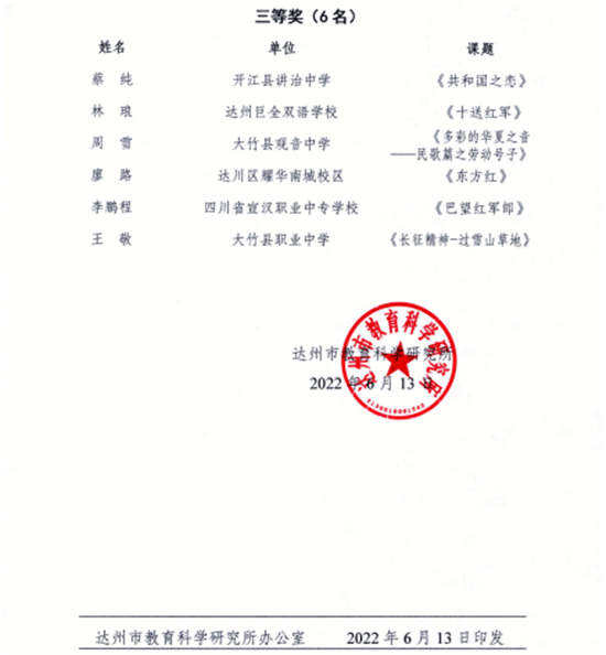 一、2022年1月,根據(jù)達(dá)市教科[2022]3號文件精神,關(guān)于開展高中音樂學(xué)科“紅色音樂課程資源(微課)”成果征集評選活動的通知,科創(chuàng)中心組織篩選了音樂教師周雪制作了題為《多彩的華夏之間——民歌篇之勞動號子》的微課參賽并取得了市三等獎。