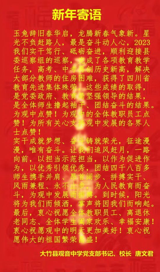 觀音中學(xué)黨總支部書(shū)記、校長(zhǎng)唐文君同志2024年新年寄語(yǔ)